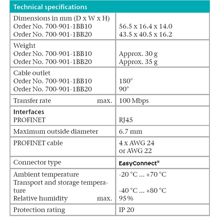 Konektor PROFINET s technologií rychlého upnutí profinet kabelu EasyConnect®. Konektor je k dispozici ve trojím provedení – přímý 0° (180°), zalomený v úhlu 90° a nově zalomený v úhlu 145°.